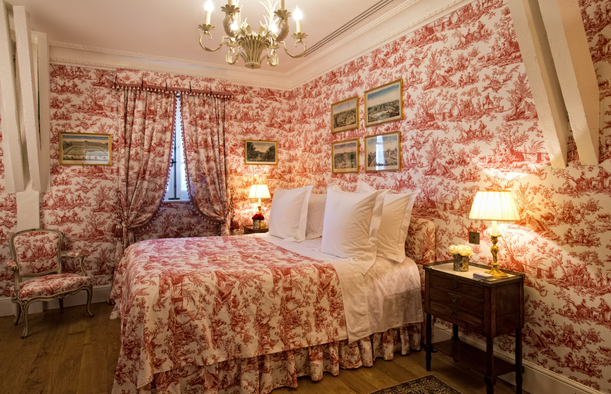 The reception rooms and three guest bedrooms, spread over two floors in a private wing of the château, are decorated in a colourful and flamboyant interpretation of 18th-century French style. The ‘Polonaise Suite’ was created from original 18th-century documents. Each suite has a private modern bathroom; the large ‘Oberkampf Suite’ even has its own private lift. Under the eaves, on the second floor it enjoys stunning views across the vines and parkland.